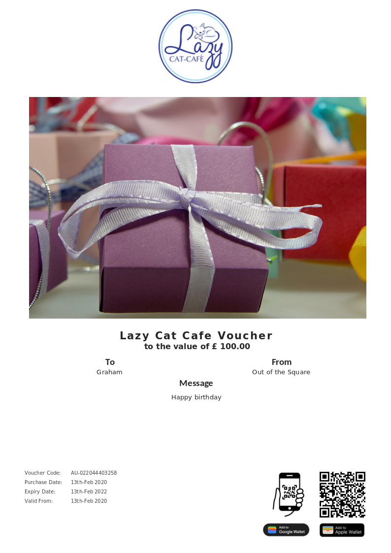 Lazy Cat Cafe allows you to purchase instantly printable gift vouchers, special offers and tickets using the Voucher Connect platform.